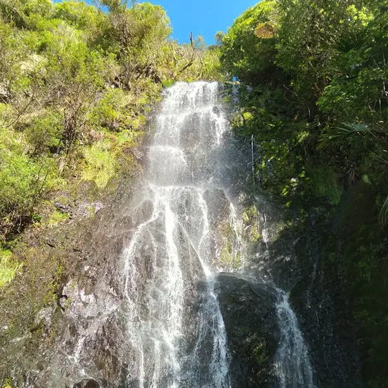 You'll climb through paddocks and forest patches before reaching a junction. Take the side track. You'll hear it before you see it: fifteen metres of water tumbling down multiple terraces.