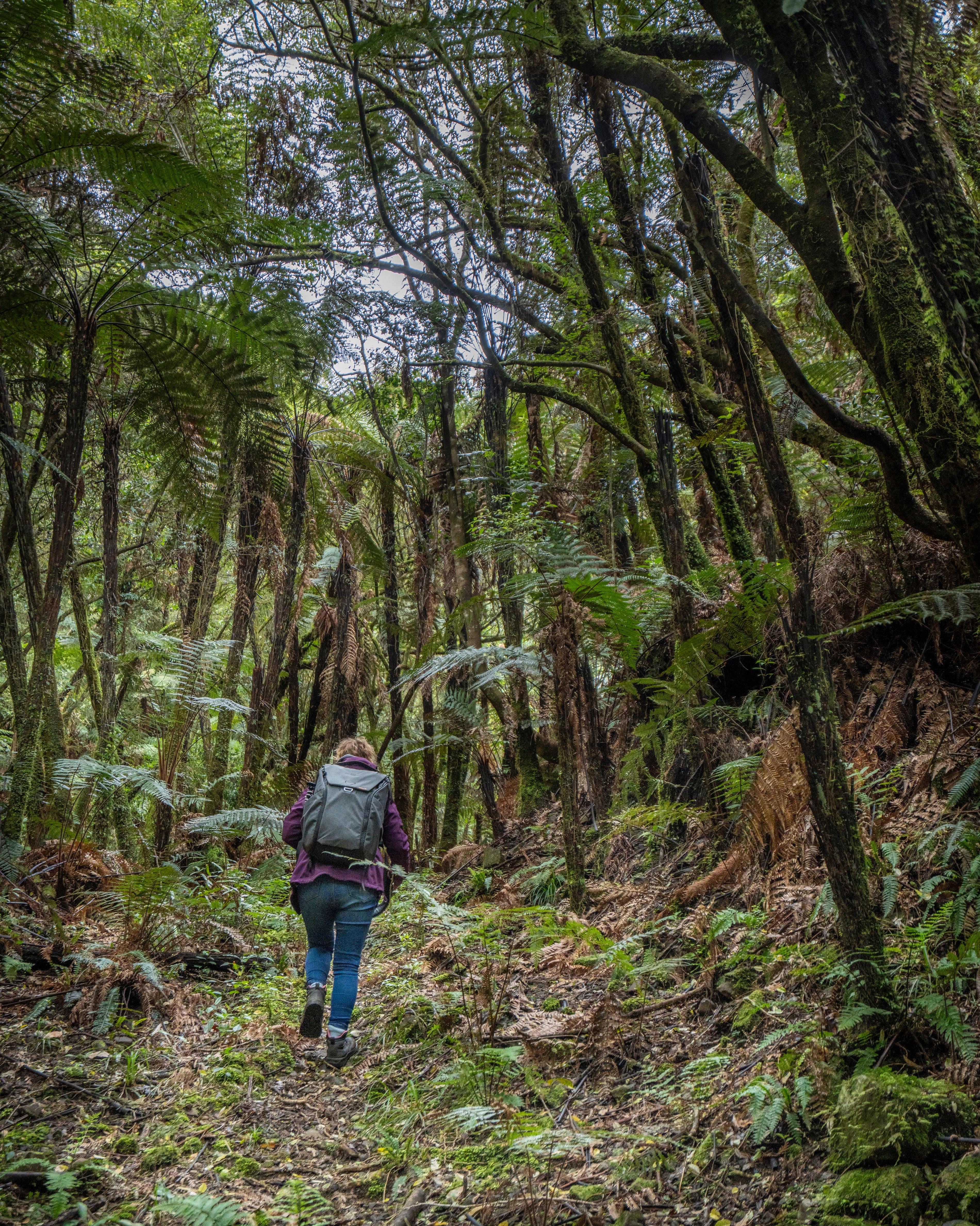The track finds the creek quickly and stays close. You'll follow it for most of the walk, working your way up through thick native bush that grows thicker the deeper you go.