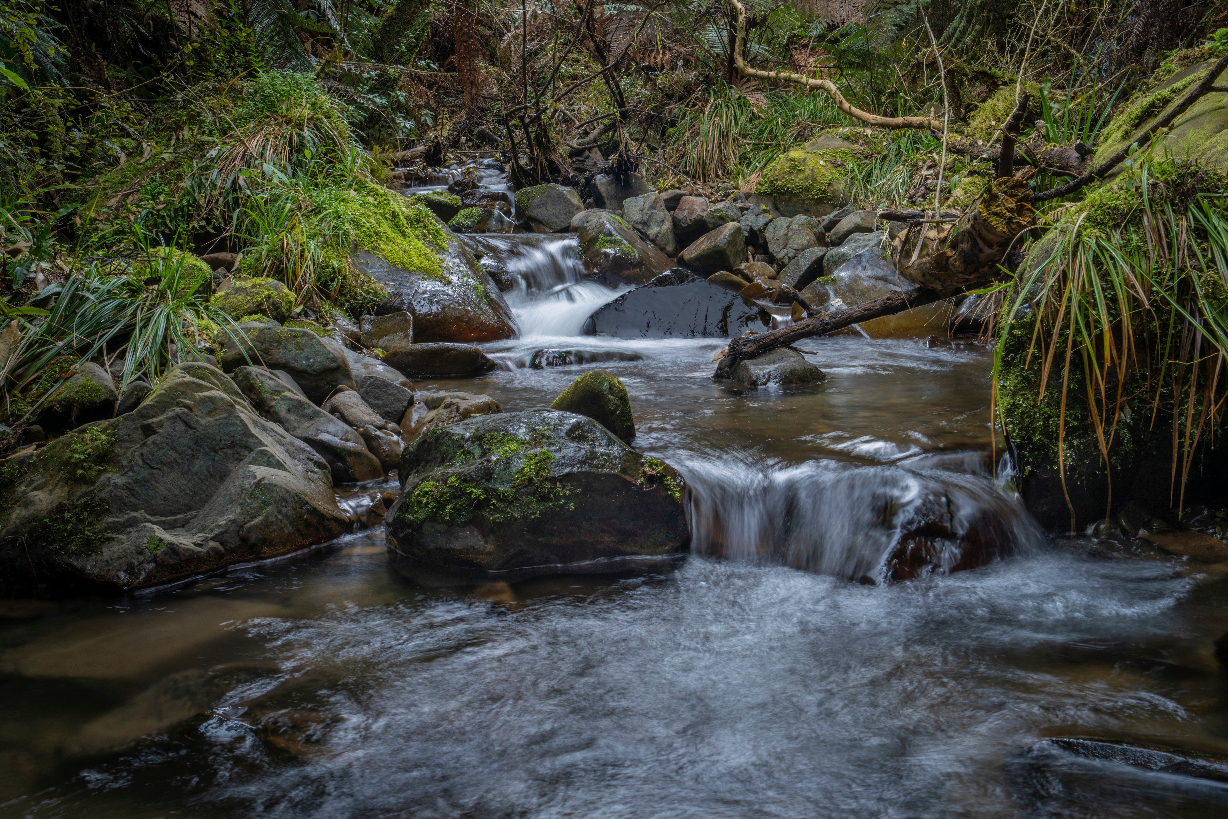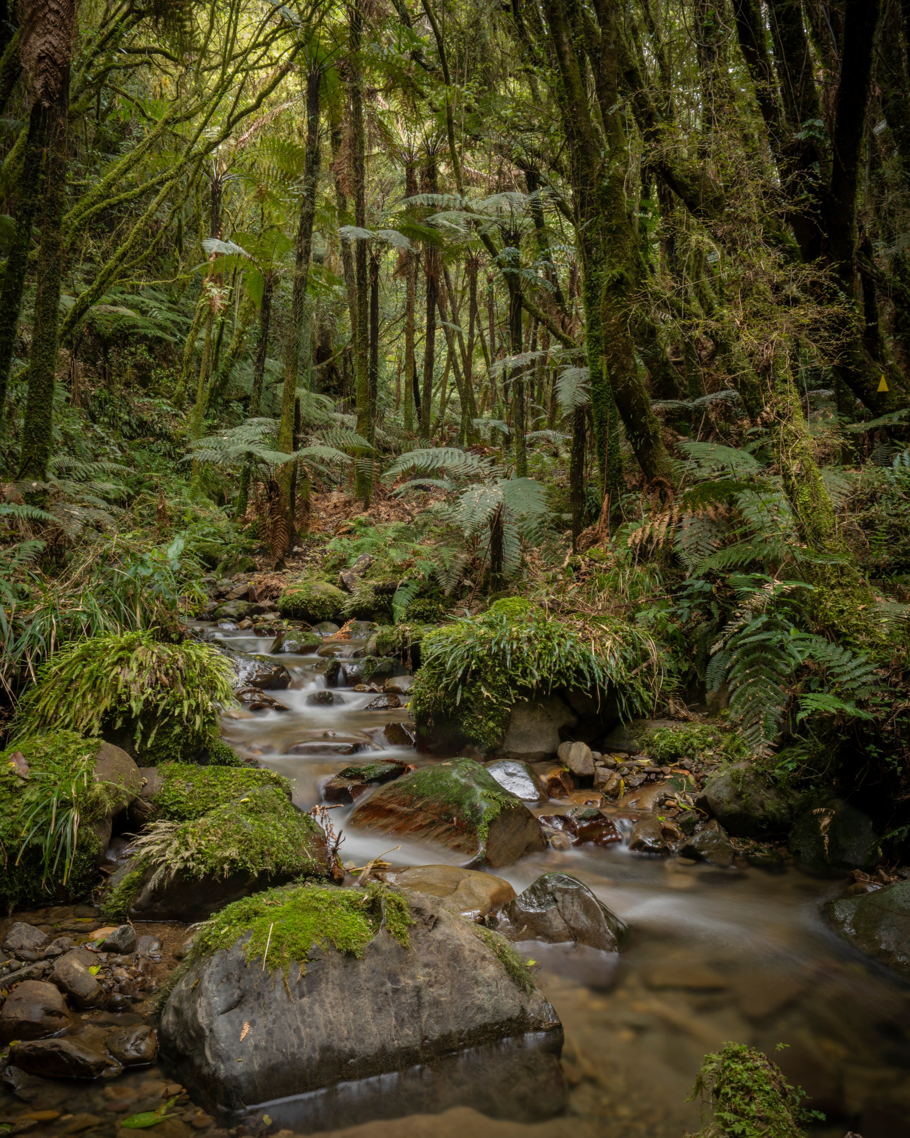 You'll follow its course, working your way up through native bush that grows thicker the deeper you go. Halfway up, the valley narrows. Water flowing over stones and logs create mini waterfalls at points, with the forest pressing in on both sides.