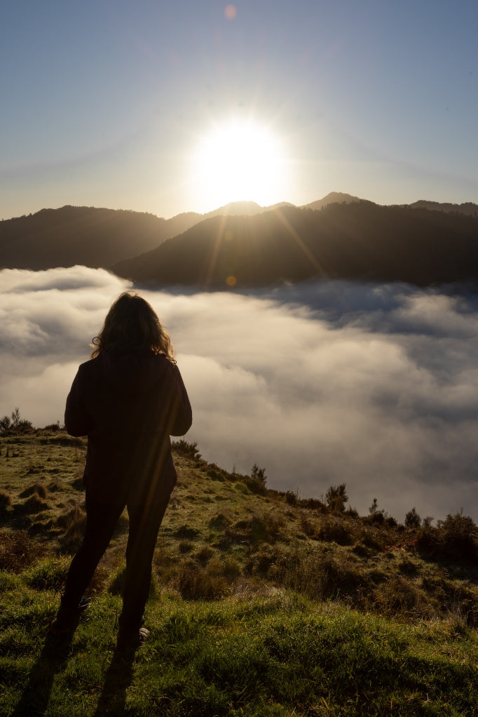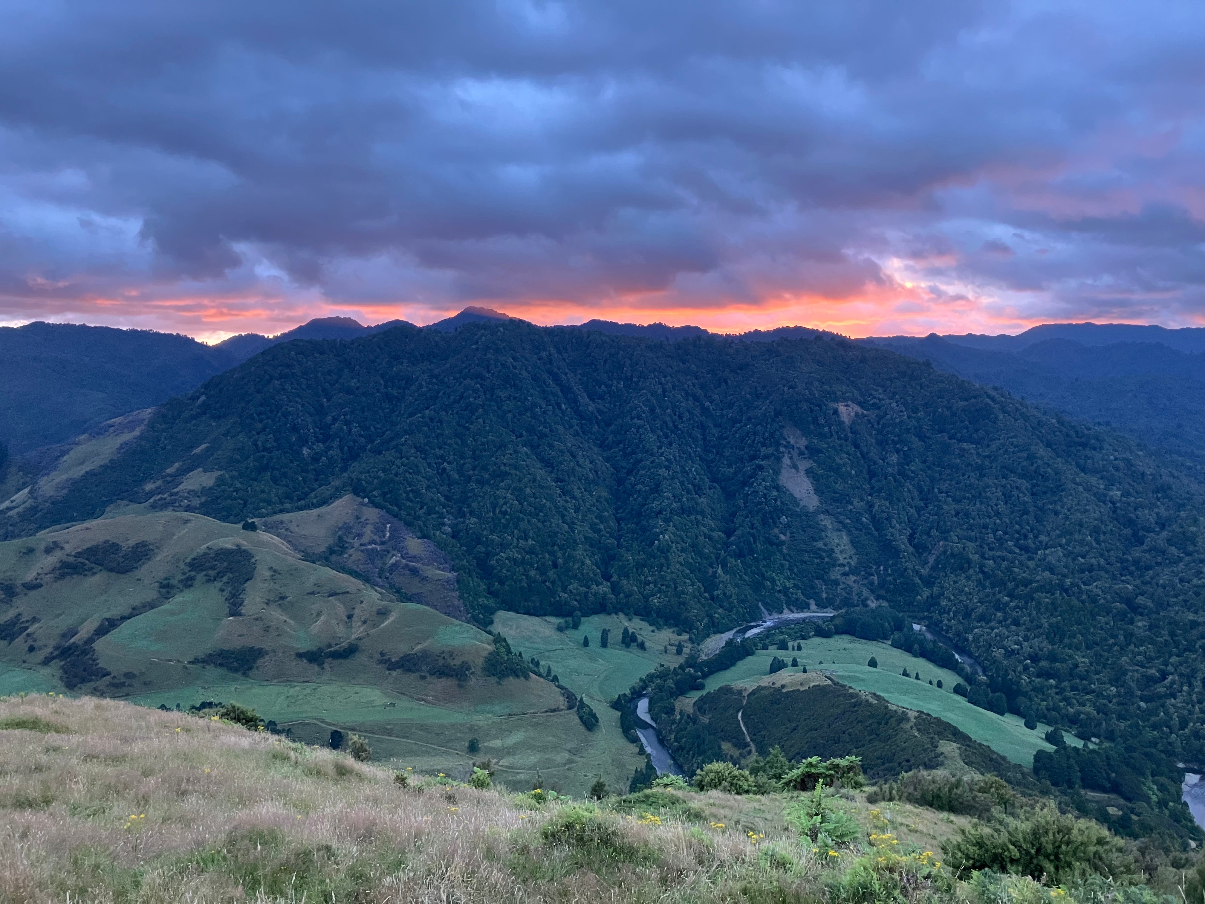 But the real moment comes after. The climb to the ridgeline. Switchbacks through scrub and forest, steady and manageable. Then you're at the viewpoint and the entire Waioweka Gorge spreads out below. River snaking away into the mountain beyond. Ranges stacked against ranges all the way to the horizon. On moody days, clouds roll through the valley like something alive.
